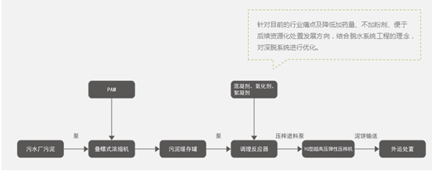 針對這些難點(diǎn),盛世環(huán)保推出了“新型污泥深度脫水處理系統(tǒng)”。系統(tǒng)由濃縮、調(diào)理、脫水技術(shù)路線組成。